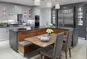 - С островом. Решение для просторных кухонь (от 15-20 кв.м). Остров может служить и дополнительной рабочей поверхностью, и барной стойкой.